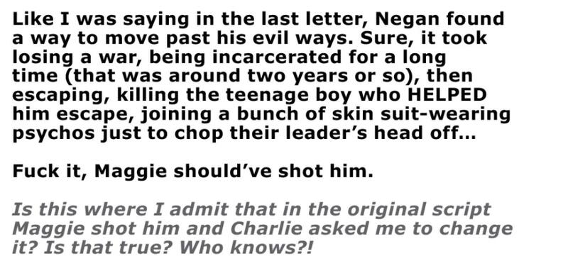 Kirkman ya había confesado en el “Letter Hacks” al final de The Walking Dead #176 que su idea original era que Maggie matara a Negan pero que había cambiado sus planes por sugerencia del dibujante del cómic, Charlie Adlard.