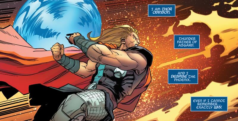 “Soy Thor Odinson. Padre del trueno de Asgard y desprecio a la Fuerza Fénix incluso si no puedo recordar... exactamente por qué”, dice el héroe mientras salta a la acción.