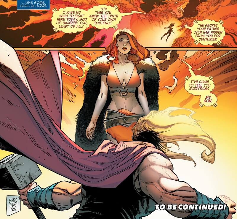 De ahí en más, el guión de Jason Aaron juega con el misterio por algunas páginas hasta que precisamente al final del número muestra a Fénix presentándose delante de Thor y diciendo: “¡No tengo deseos de pelear aquí hoy, Dios del Trueno! ¡Contigo menos que todos! Es hora de que sepas la verdad sobre tu existencia. He venido a contarte todo, mi hijo”.