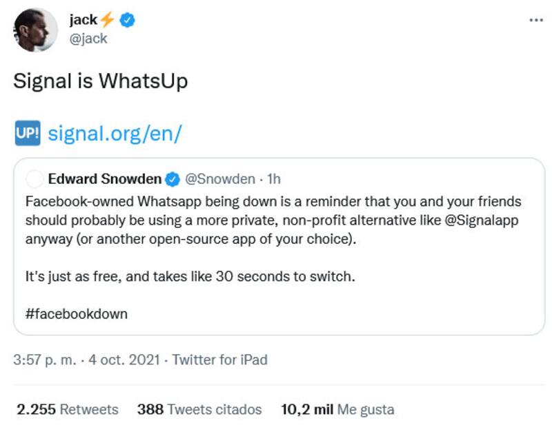 Y como la situación no podía quedarse ahí, Jack Dorsey citó una publicación de Edward Snowdewn que promovía a Signal como una alternativa ”más privada y sin fines de lucro”.