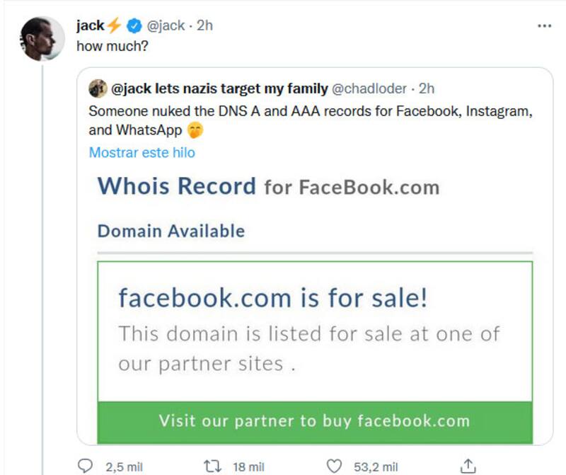 Sin embargo las mofas no se quedaban ahí. Luego de que se diese a conocer que los problemas de Facebook tenían relación con un incidente con sus registros DNS, Jack preguntó cuánto costaba comprar los dominios de la plataforma de Mark Zuckerberg. Probablemente para dejar las cosas tal como se instalaron durante la caída de los servicios.