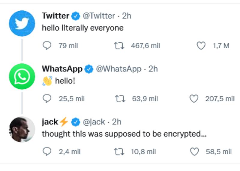 Por ejemplo, la cuenta oficial de Twitter saludó a todos ante el incremento de visitas a su plataforma ante la caída de los productos de Facebook. En ese escenario, la cuenta oficial de Whatsapp los saludó de vuelta, sin embargo Dorsey atacó directo a la yugular.