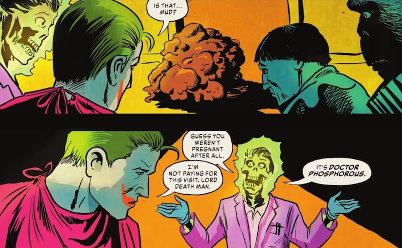 Por supuesto, estamos hablando de un cómic y lo que se puede ver en una viñeta claramente no es el contexto completo y la historia total de The Joker: The Man Who Stopped Laughing #4 básicamente establece que después de ser derrotado por Zatanna el Joker sin querer ingirió un poco de Clayface y eso se fue a su estómago. Pero como el villano creyó que la heroína no había hechizado, uno de sus secuaces planteó que estaba embarazado.