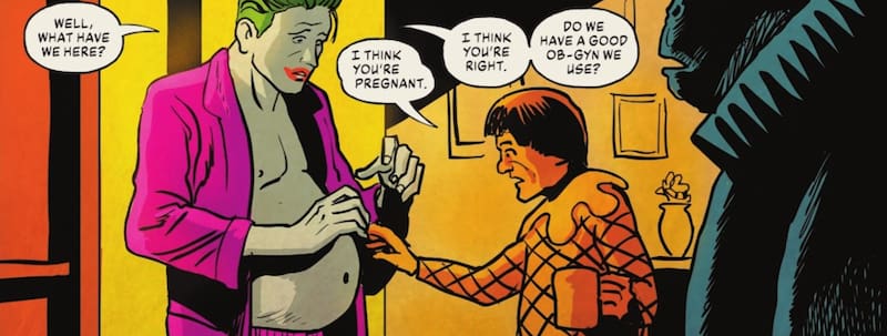 Resulta que al final de ese número del cómic enfocado en el Joker, en el contexto de una historia extra, se mostró el “embarazo” del enemigo de Batman.