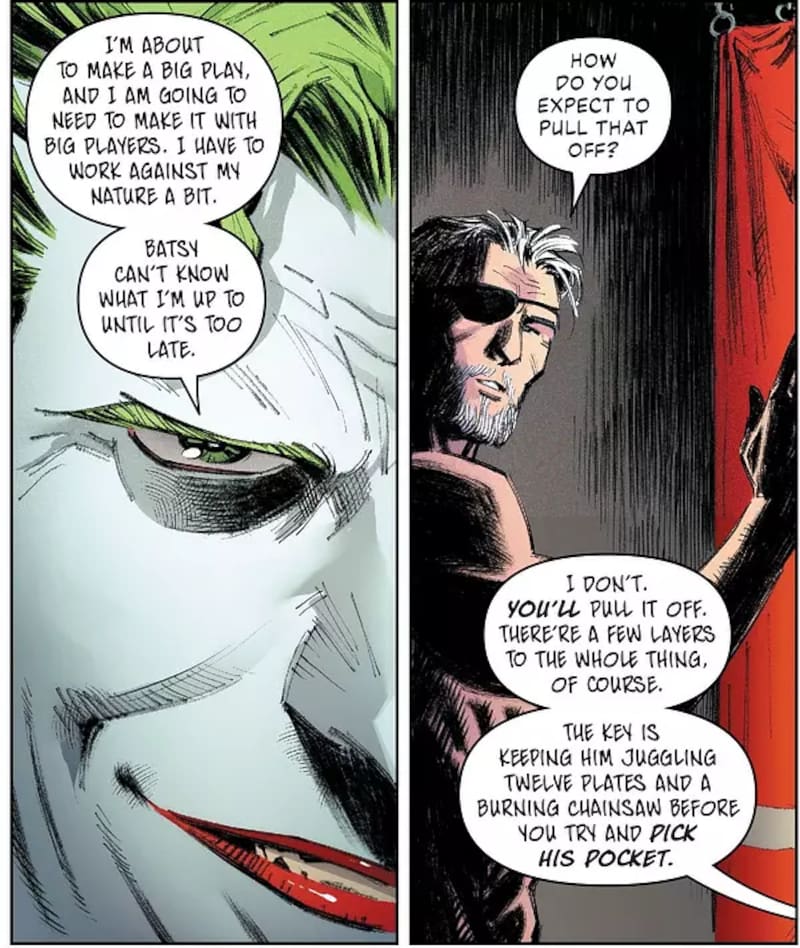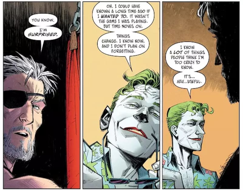 Deathstroke, por su parte, también conoce esa información, pero está sorprendido de que el Joker lo supiese. Sin embargo, el villano de la sonrisa reconoce que pudo haberlo sabido hace muchísimo tiempo, pero eso iba contra su plan. Algo que ahora cambió.