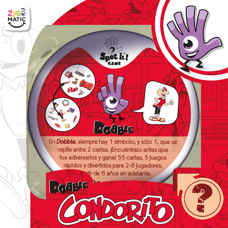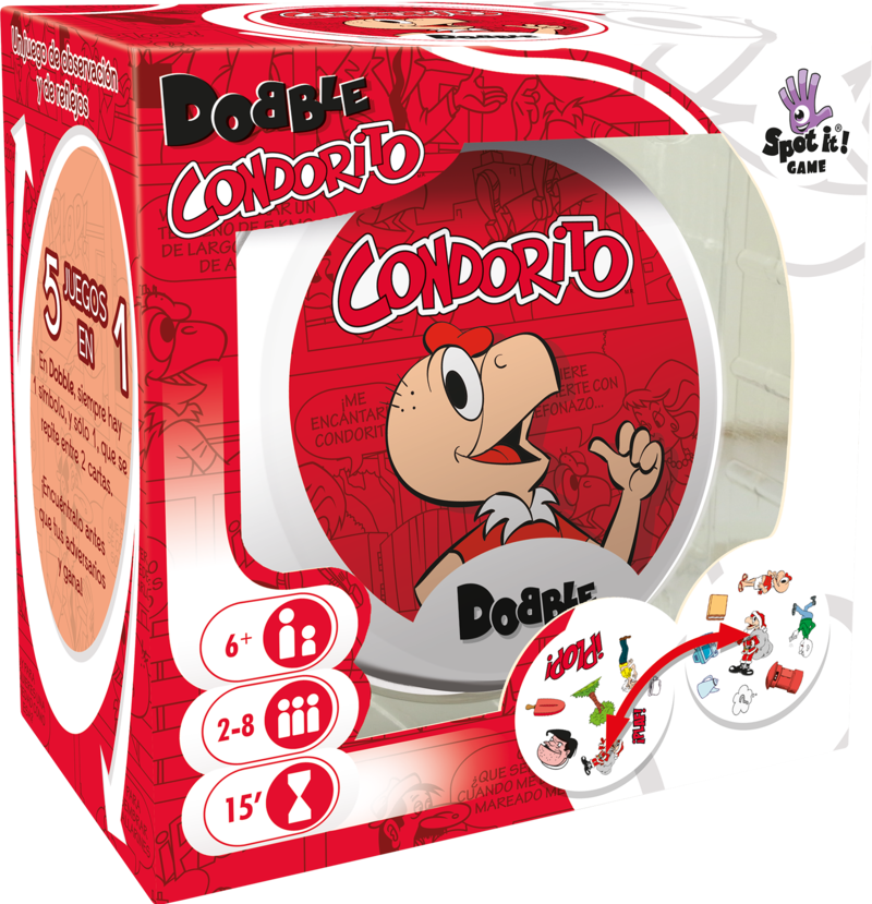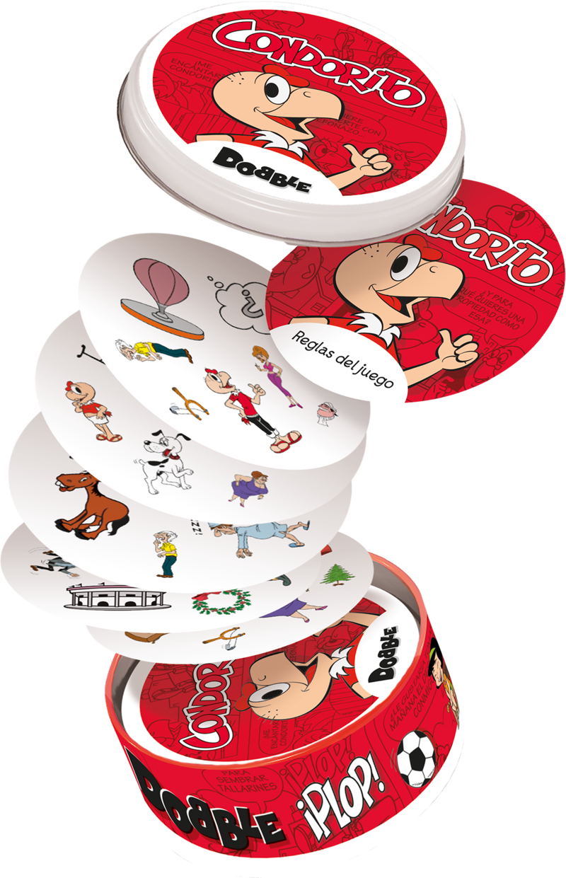 Dobble Condorito está basado en el juego original que consiste en observación rápida y ágil de cartas con símbolos en ella. Esta nueva versión se inspira en el cómic creado por Pepo e incluye varios personajes de las tiras cómicas como Coné, Tremebunda, Yayita y Washington, además de otros elementos visuales como el característico ¡Plop! que remata cada historia.