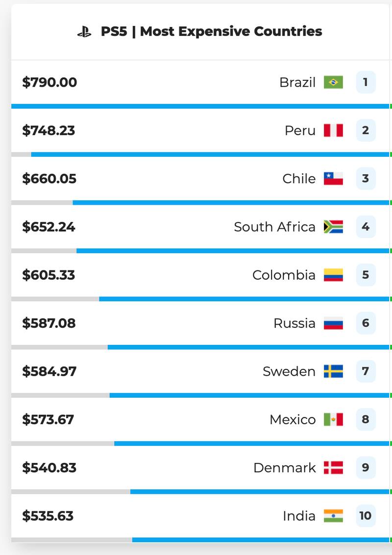 Obviamente, como plantea el gráfico, los jugadores de Brasil y Perú comparten el problema de los fanáticos de los videojuegos chilenos ya que esos dos países lideran la medición con los PS5 edición digital más caros del mundo.