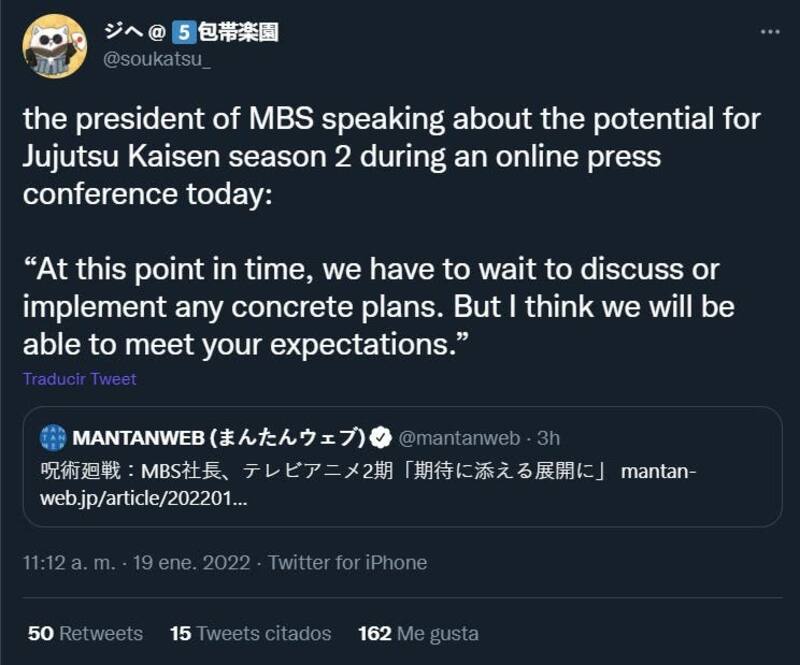 La estación de televisión japonesa MBS durante este miércoles realizó una conferencia de prensa, donde su presidente Yōichi Mushiaki comentó sobre la posibilidad de una segunda temporada del animé Jujutsu Kaisen.