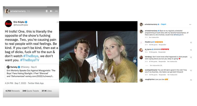 Mediante las historias de su cuenta de Instagram, Moriarty compartió el tweet de Kripke y posteriormente trató de zanjar el tema con una nueva foto del rodaje del cuarto ciclo de The Boys.