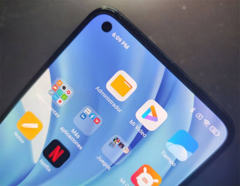Al mismo tiempo, este Mi 11 Lite también destaca por casi no tener bordes y contar con una cámara frontal (de 16 megapíxeles con apertura f/2.5.) que está ubicada en un agujero situado en la esquina superior izquierdo.