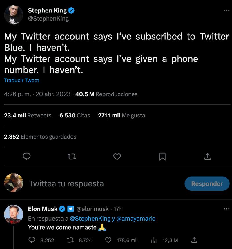 Reuslta que el autor de It contaba con una cuenta de Twitter verificada por el sistema antiguo de la red social, pero como muchos individuos no quiso suscribirse a Twitter Blue por lo que tenía que perder el ticket azul de su cuenta durante el jueves pasado. Sin embargo, eso no sucedió.