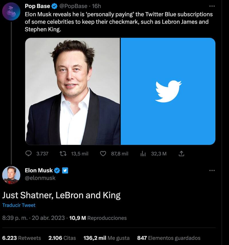 El tweet de King no tardó en llamar la atención de los medios y los usuarios de Twitter por lo que eventualmente se reveló la razón de su misteriosa suscripción a Twitter Blue: Elon Musk.