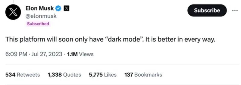 La decisión, que por ahora no tiene fecha de implementación,se debe a que Musk considera que el modo oscuro es “mejor en todos los sentidos”. Y asi lo plasmó en un tweet que ya eliminó.