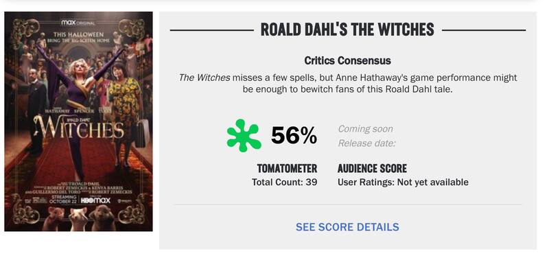 Como pueden apreciar parece que el consenso general sobre The Witches no es muy favorable y de hecho esas apreciaciones precisamente forman parte del veredicto sobre la película en el portal Rotten Tomatoes donde, junto al 56% de valoraciones positivas, dice: “The Witches pierde algunos hechizos, pero la actuación de Anne Hathaway podría ser suficiente para hechizar a los fanáticos de esta historia de Roald Dahl”.
