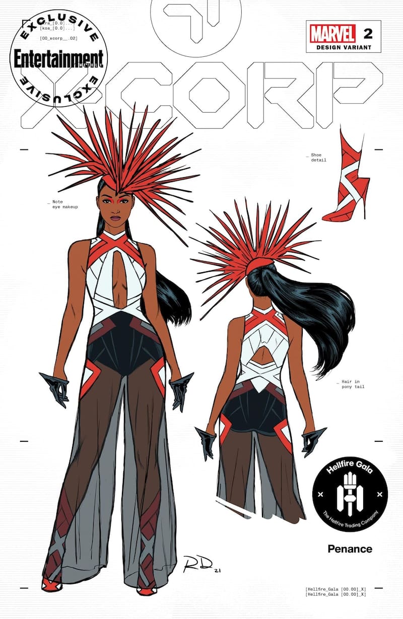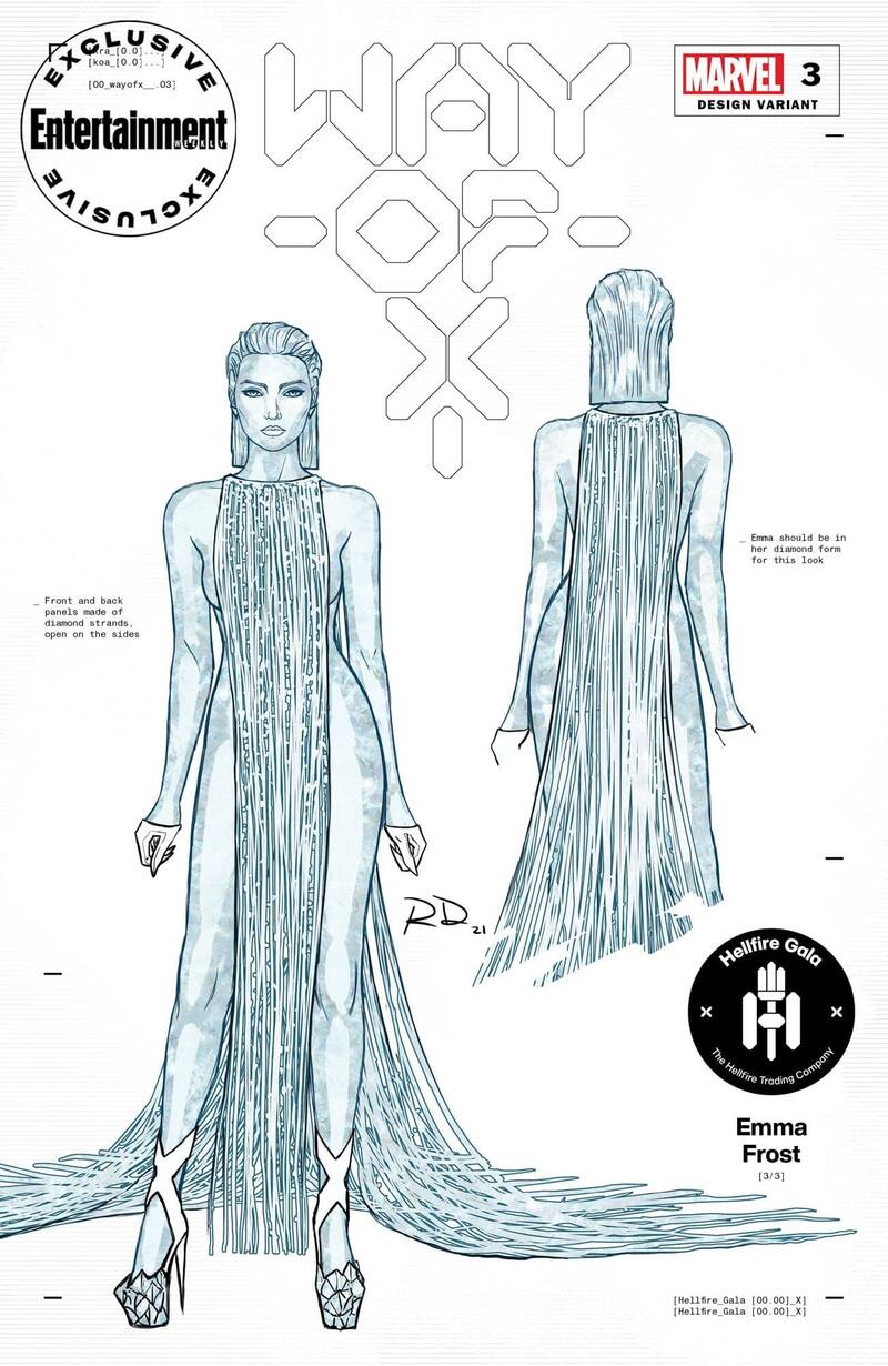 Dauterman tiene explicaciones detalladas para cada uno de esos trajes, pero en general el artista dice su idea era realizar atuendos de alta costura pero al nivel de los mutantes.