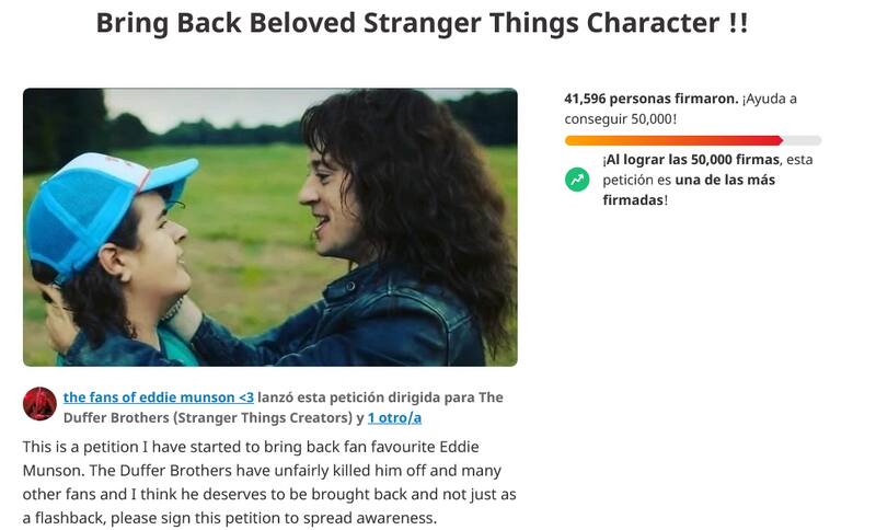 Creada poco después del estreno del segundo volumen, la petición busca reunir 50 mil firmas con el objetivo de traer de vuelta a Munson. “Los Duffer lo mataron injustamente y creo que merece ser traído de vuelta y no solo como un flashback”, agrega la petición.