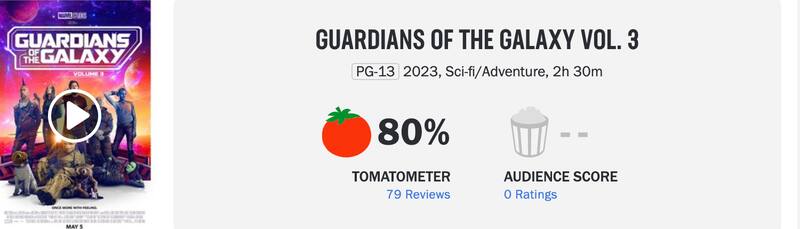 Al momento de redactar esta nota y contando 79 reseñas, Guardianes de la Galaxia Vol. 3 tiene unj 80% de valoraciones positivas en Rotten Tomatoes.