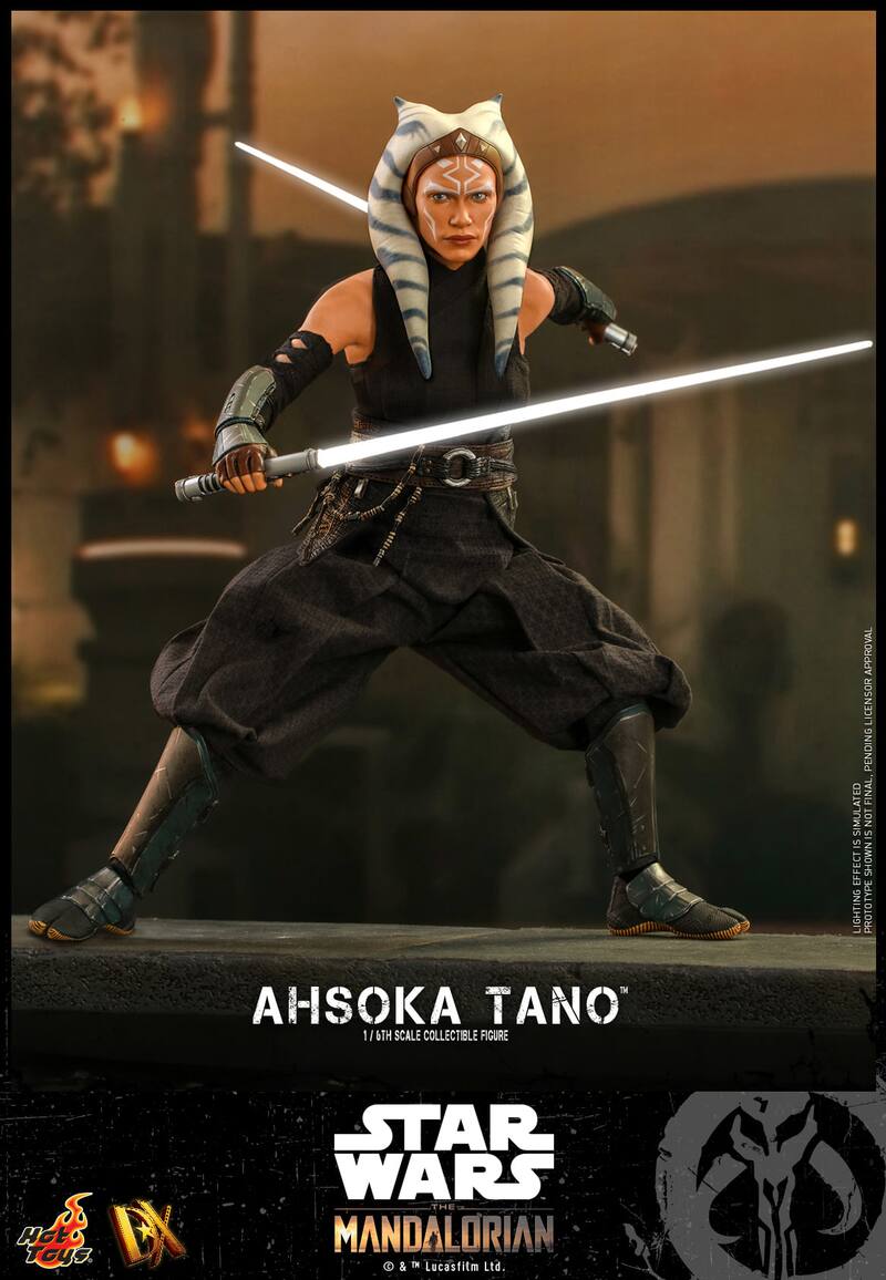 La figura de Ahsoka mide 28,5 cm, tiene 28 puntos de articulación y cuenta con una detallada representación del rostro basado en la actriz Rosario Dawson que puede girar los ojos y mover las colas de su cabeza. También incluye cinco pares de manos intercambiables, una capa con efectos de suciedad, sus dos sables de luz blancos, y un fondo con un pedestal para su exhibición.