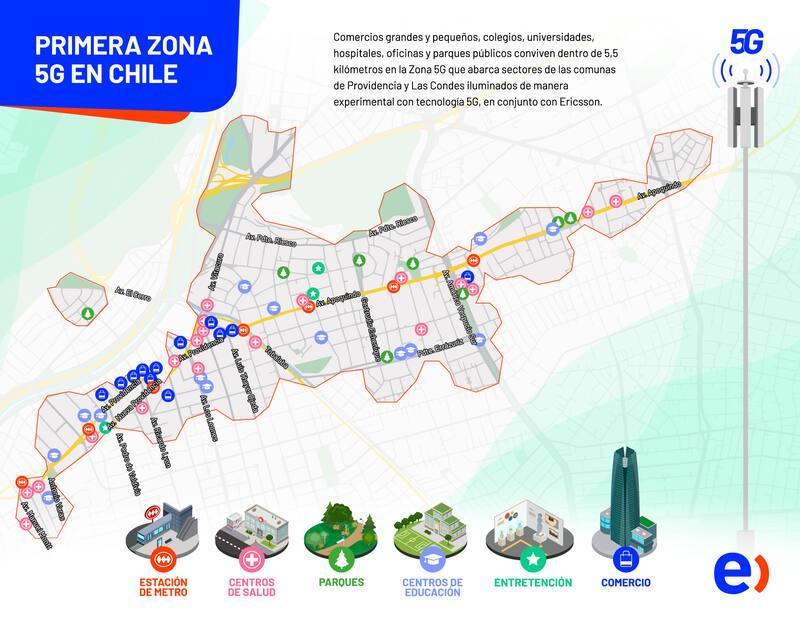 En una propuesta avalada por el Ministerio de Transportes y Telecomunicaciones (MTT), junto a las compañías Entel y Ericsson, la zona en cuestión estará ubicada en el eje Providencia-Apoquindo, entre Pedro de Valdivia y Escuela Militar, extendiéndose por 5,5 kilómetros e implementando frecuencias propias de la tecnología 5G, como la de 3.500 MHz y la de 700 MHz.