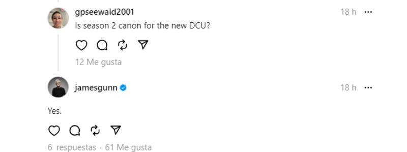 A través de Threads es que Gunn fue consultado si es que la segunda temporada de la serie protagonizada por John Cena sería canon del nuevo DCU, a lo que este respondió “Sí”.
