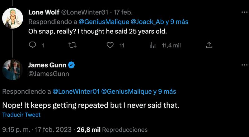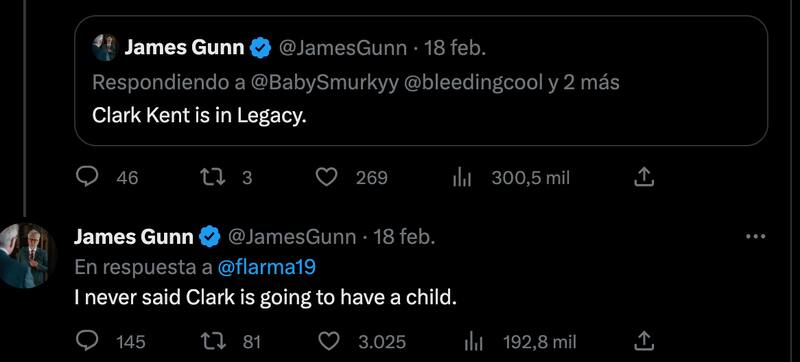 Concretamente, después de que un usuario citara un artículo que abordaba el tema, Gunn dijo que “(...) la gente está especulando sobre ambas edades. Todo lo que dije fue que Superman era más joven que cuarenta y Batman PODRÍA ser un par de años mayor que Superman”. Y además afirmó que nunca dijo que Superman tendría 25 años en Superman: Legacy.
