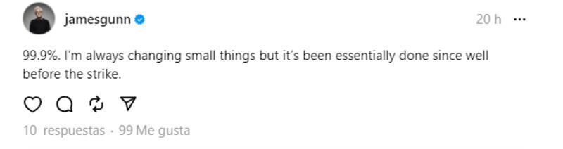 A través de Threads es que el director y encargado del nuevo universo cinematográfico DC, fue consultado al respecto dando a conocer la situación y señalando que “Siempre estoy cambiando pequeñas cosas, pero básicamente se ha hecho desde mucho antes de la huelga”.