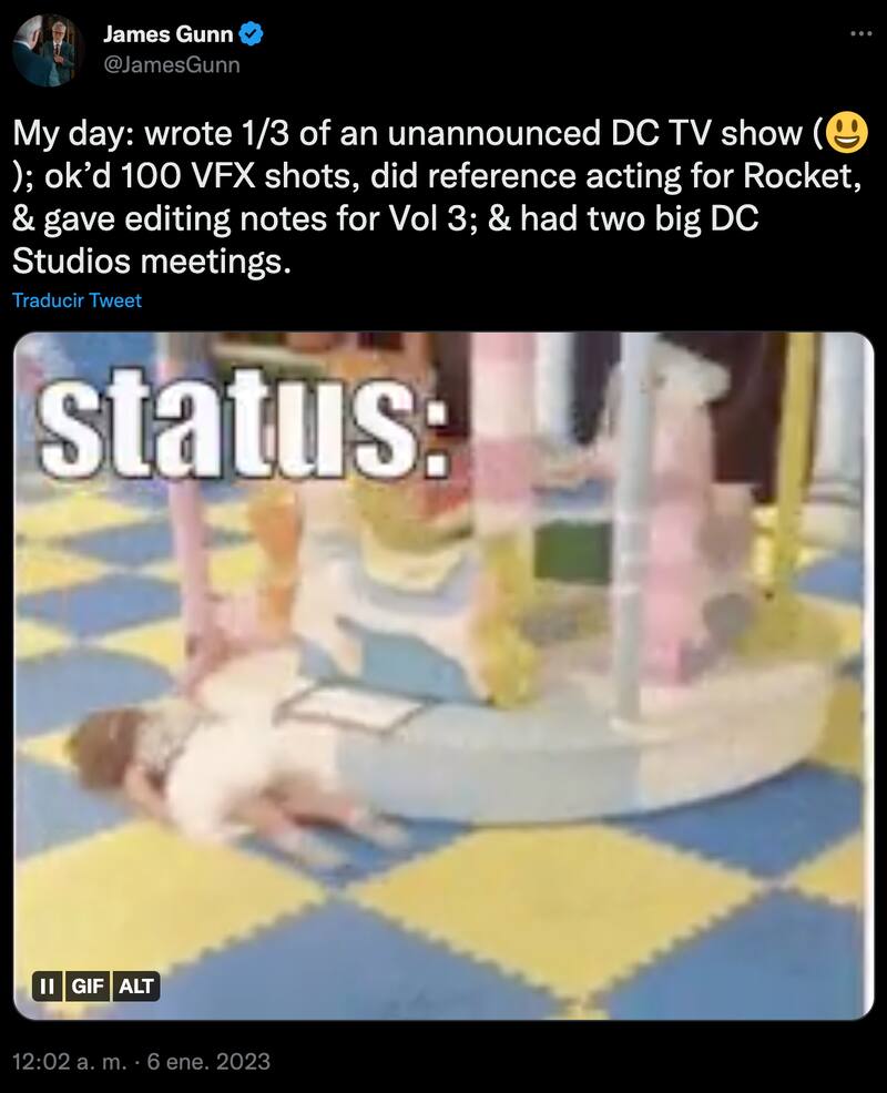 “Mi día: escribí 1/3 de un programa de televisión de DC no anunciado; aprobé 100 tomas de efectos visuales, hice referencias de actuación para Rocket y di notas de edición para el Vol. 3. Y tuve dos grandes reuniones de DC Studios”, escribió Gunn.