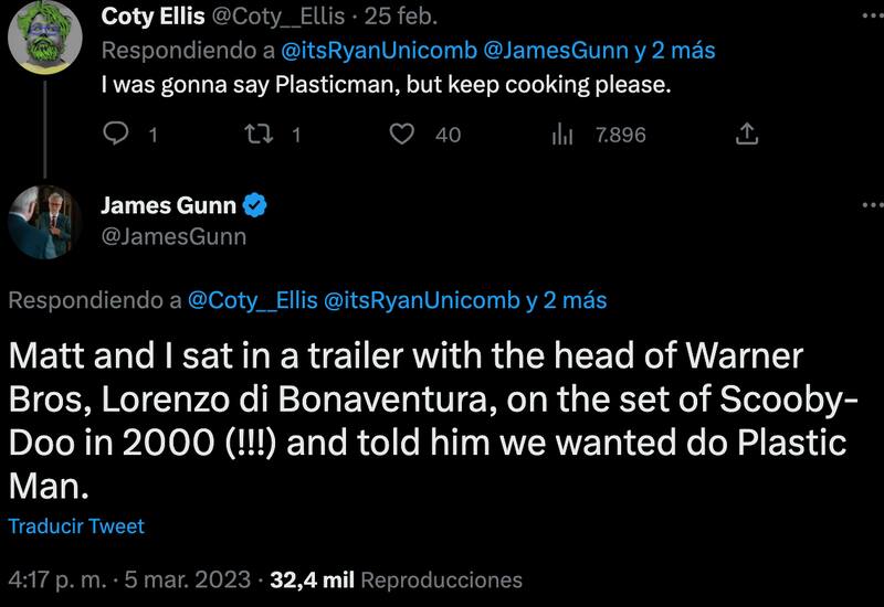 “Matt (Lillard) y yo nos sentamos en un tráiler con el jefe de Warner Bros, Lorenzo di Bonaventura, en el set de Scooby-Doo en 2000 (!!!) y le dijimos que queríamos hacer Plastic Man”, escribió Gunn.