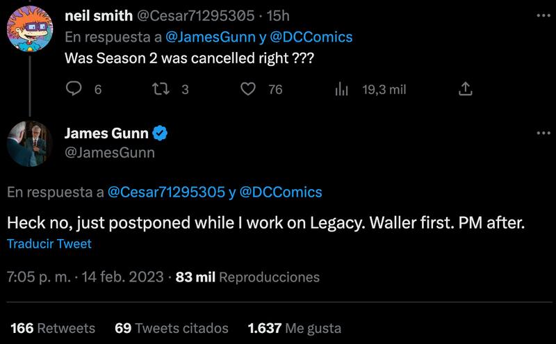 A través de Twitter Gunn le respondió a un fanático que preguntó si la serie protagonizada por John Cena había sido cancelada: “Diablos, no, solo lo pospuse mientras trabajo en Legacy. Waller primero. (Peacemaker) después”.