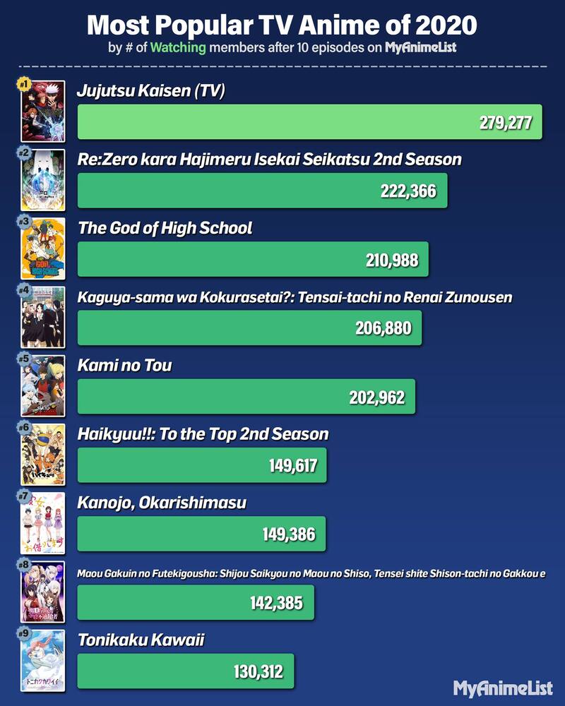 El sitio de esta forma tuvo en primer lugar el anime basado en el manga de Gege Akutami, con 279.277 miembros viendo la serie, y fue seguido por la segunda temporada de Re:Zero con 222.366 usuarios viéndola.