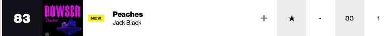 Si bien “Peaches” no alcanzó a destronar a “Last Night” de Morgan Wallen del puesto número 1 ni tampoco entró en el Top 10 que incluye a cantantes como Taylor Swift, Drake, Miley Cyrus, SZA y The Weekend, la canción para la Princesa Peach se quedó con el puesto número 83 en el ranking semanal de Billboard. Una hazaña no menor para una canción original derivada de una película animada sobre un videojuego.