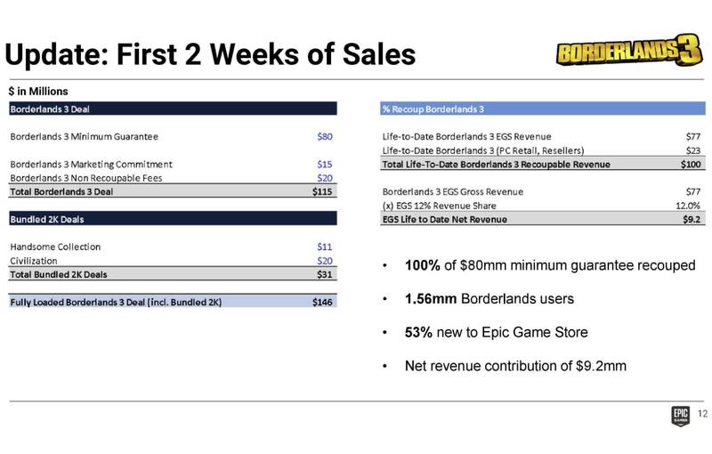 A pesar de la enorme cifra que involucró la exclusividad de Borderlands 3, según se conoció, en sus primeras dos semanas el juego ya había generado 100 millones de dólares, lo que ya cubría el mínimo garantizado que había pagado Epic Games Store por la exclusividad. De estos, 77 millones corresponden a ventas directas en Epic Games Store y 23 millones a revendedores y minoristas de PC.