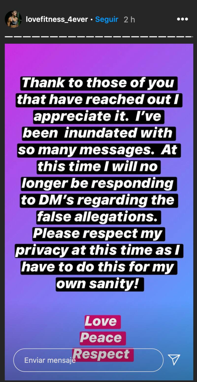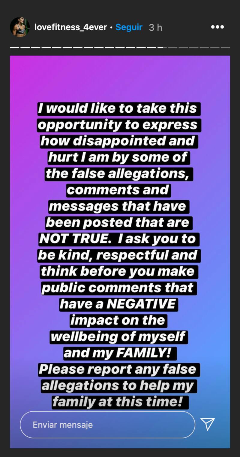 “¡Les pido que sean amables, respetuosos y piensen antes de hacer comentarios públicos que tienen un impacto negativo en mi bienestar y el de mi familia! ¡Por favor, reporten cualquier acusación falsa para ayudar a mi familia en estos momentos!”, concluyó.