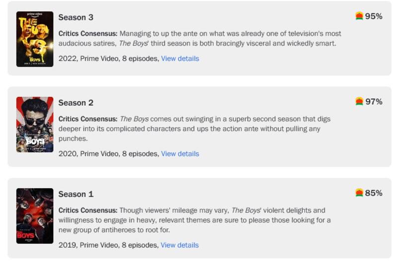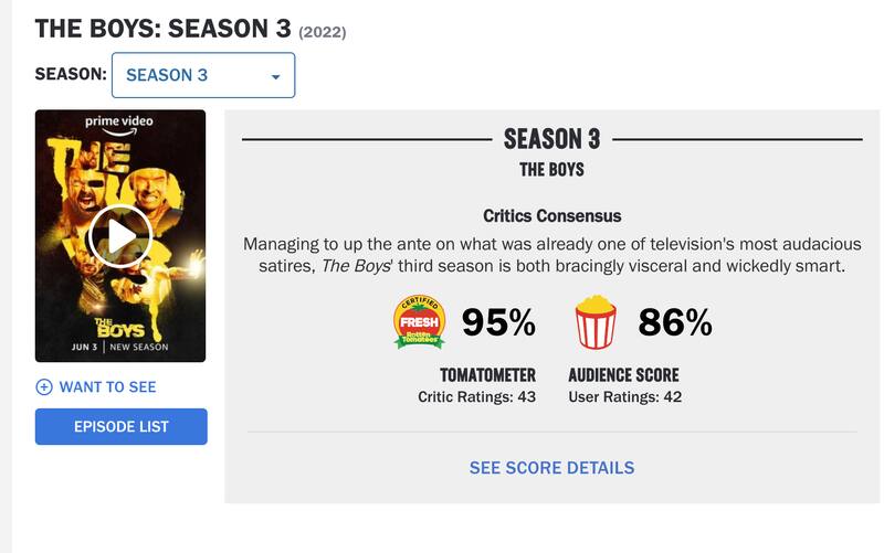 Siguiendo el estreno de los tres primeros episodios de la tercera temporada de The Boys durante este 2 de junio mediante Prime Video, Rotten Tomatoes habilitó su sección para la tercera temporada de la serie y allí se planteó que con 43 reseñas al momento de la redacción de esta nota la tercera temporada de The Boys tiene un 94% de aprobación. Todo en paralelo a un 86% de valoraciones favorables por parte del público.
