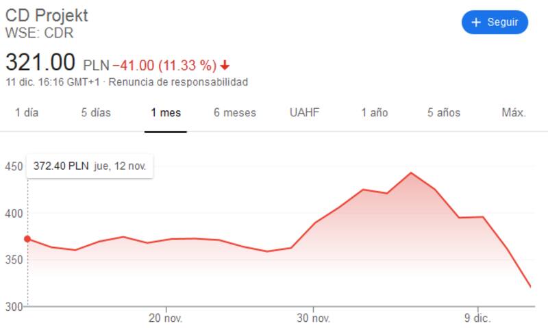 Desde el pasado 4 de diciembre, en donde las acciones del estudio de videojuegos CD Projekt Red llegaron a los 443 zloty (que es la moneda polaca), el valor de la compañía cayó en un 29%, instalando su valor por acción en los 313.9 zloty. Todo esto se concretó justo en medio del lanzamiento de la nueva obra de la compañía, el esperado videojuego Cyberpunk 2077.