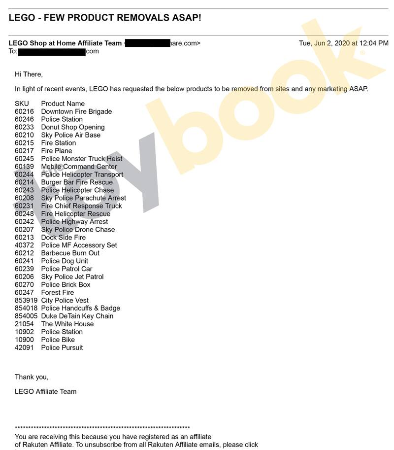 Según apunta Toy Book, los correos fueron enviados el martes, y en el pedían a los vendedores no publicitar todo un listado de sets que incluía estaciones de policías, vehículos policiales, e incluso un puesto de donas que incluía una figura de policía.