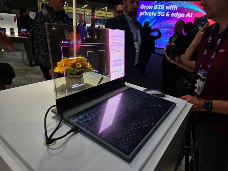 Parte de la demostración del equipo consistía en colocar un florero tras la pantalla y dentro del PC, un video de una mariposa o un colibrí volando alrededor mezclando así la realidad con lo digital. El teclado, en tanto, también es trasparente pero utiliza un sistema de proyección que solo se ilumina cuando el usuario posa su mano en el trackpad o bien en las “teclas” del mismo.