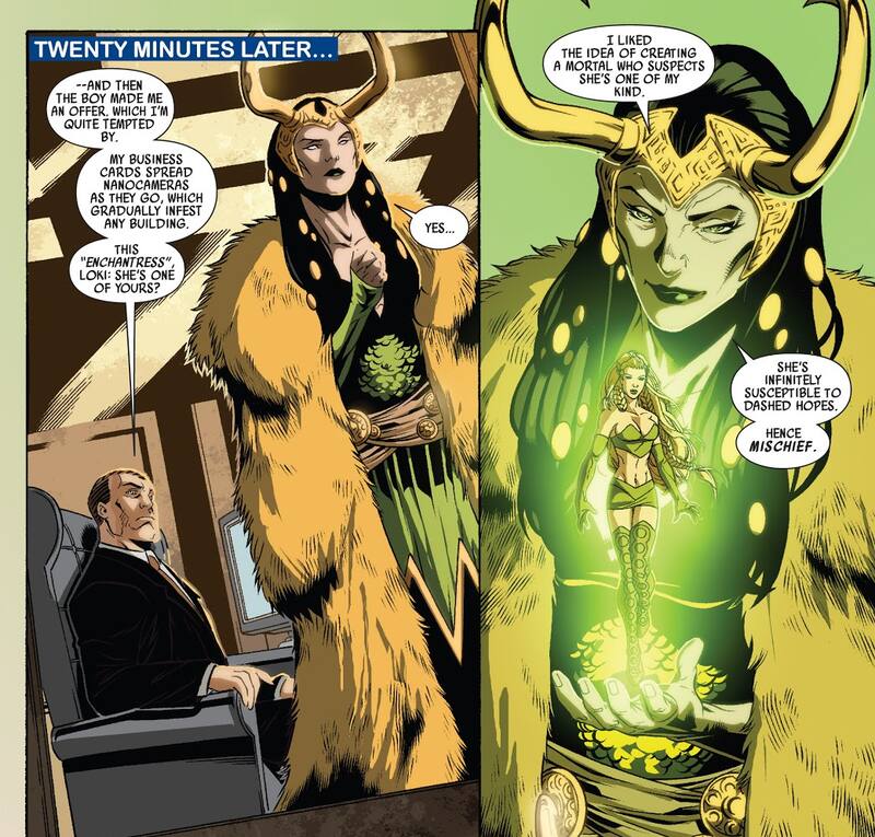 “Me gustó la idea de crear un mortal que sospecha que es uno de los míos”, dijo Loki. “Ella es infinitamente susceptible a las esperanzas frustradas y, por lo tanto, al engaño”.