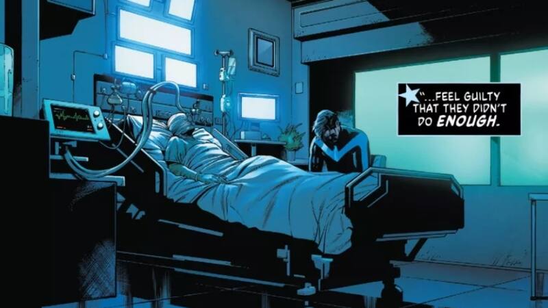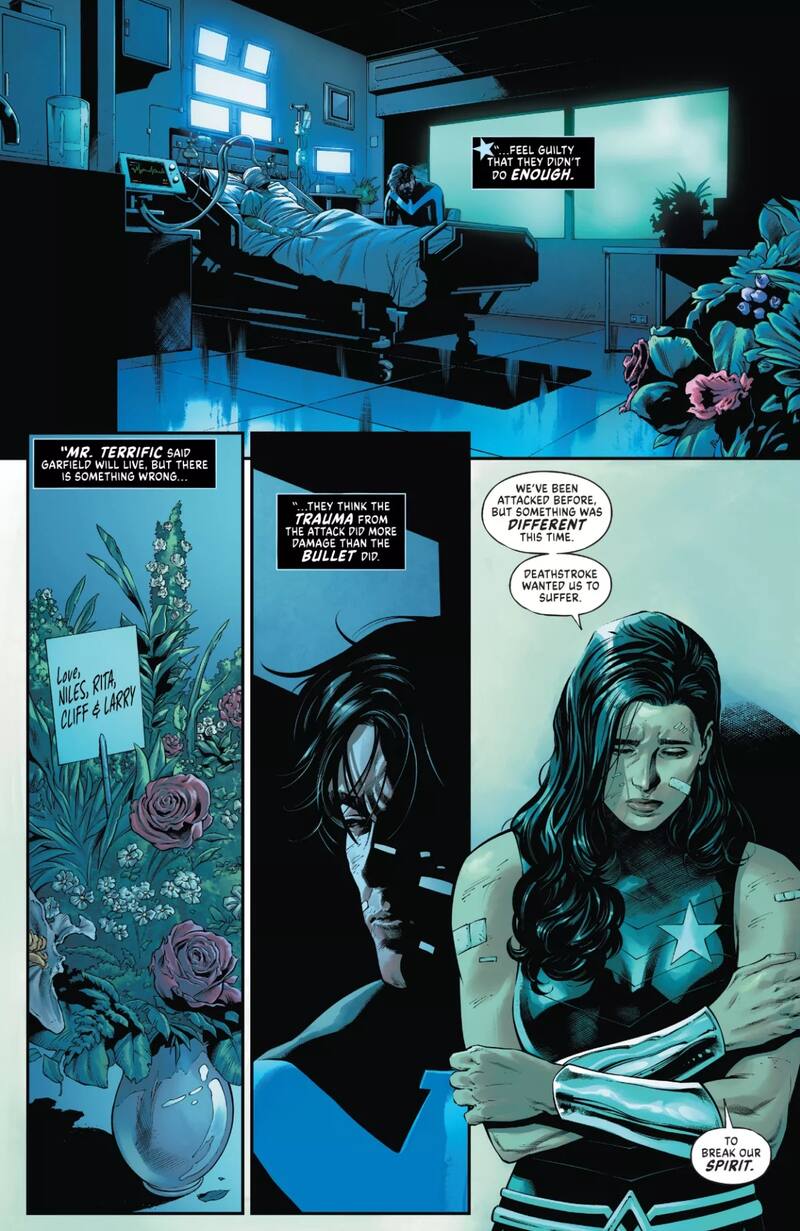 Como podrán ver más adelante, este avance comienza mostrando el panorama en el Universo DC antes de presentar a Dick Grayson/Nightwing junto a Grafield Logan/Beast Boy en un Hospital. Todo como consecuencia del disparo de Deathstroke que hirió al héroe capaz de transformarse en distintos animales.