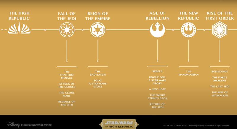 En el marco de una transmisión en vivo donde se presentaron varias publicaciones que serán parte de la propuesta de The High Republic, Lucasfilm reveló una línea de tiempo que sitúa a esta época al comienzo de todo y divide la historia de la galaxia muy, muy lejana en seis períodos: “The High Republic” (”La Alta República”), “Fall of The Jedi“(”Caída de los Jedi”), “Reign of The Empire” (”Reinado del Imperio”), “Age of Rebellion” (Era de rebelión), “The New Republic” (”La nueva república”) y “Rise of the First Order” (Ascenso de la Primera Orden).