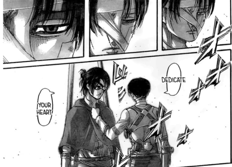 Cuando Hange, quien actualmente era la comandante del Cuerpo de Exploración, decide atacarlos sola, es que Levi, quien aún está herido, le dice unas últimas palabras, que dedique su corazón, para luego dejarla partir a una muerte segura. En la ocasión, también nombra a Armin como su sucesor en el cargo, con lo cual el portador del poder del titán colosal ahora es el de mayor rango incluso por sobre Levi.