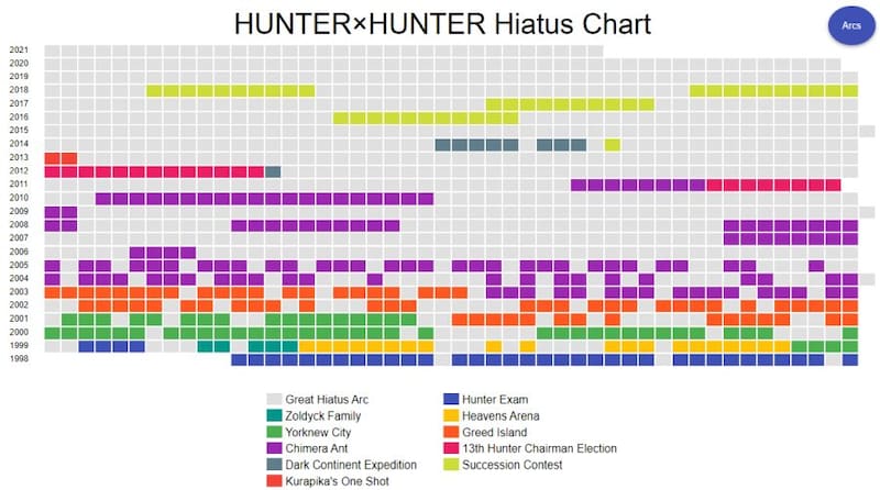 Según el sitio Hunter x Hunter Hiatus Chart, que sigue la regularidad de la publicación del manga, el último capítulo que tuvo la obra se lanzó el 26 de noviembre del 2018, con lo cual a la fecha ya se han cumplido exactamente 1001 días.