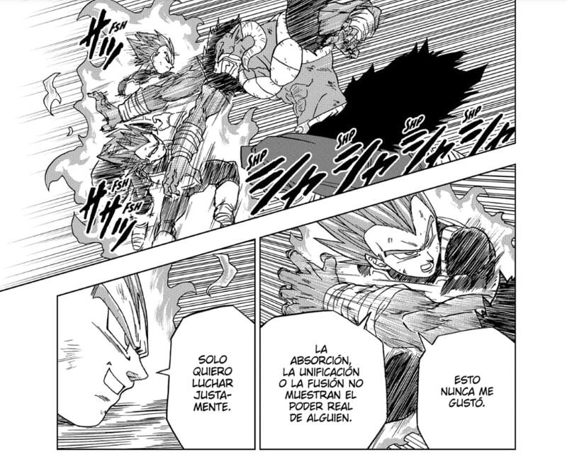 Vegeta, además explicó que nunca le gustó la absorción, unificación o fusión, ya que no muestran el poder real de alguien, y el sólo quiere luchar justamente.