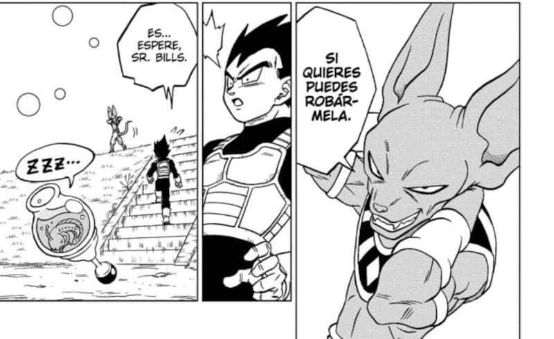 Tras escuchar esto, Vegeta le pide que lo entrene, sin embargo Beerus se niega. A pesar de esto -y como se ha vuelto habitual en este personaje que al parecer le ha tomado cariño a los saiyajins- le comenta que irá a hacer algo de ejercicio y si quiere puede ir y “robársela”.