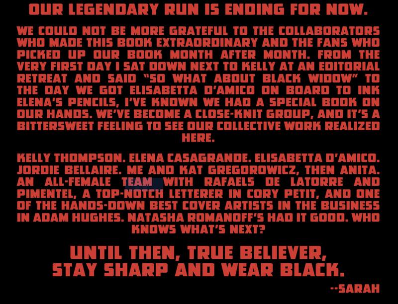 “Nuestra carrera legendaria está terminando por ahora- No podríamos estar más agradecidos con los colaboradores que hicieron que este libro fuera extraordinario y con los fanáticos que eligieron nuestro libro mes tras mes. Desde el primer día me senté junto a Kelly en un retiro editorial y dije: ¿Y qué hay de Black Widow? Hasta el día en que Elisabetta D’Amico se incorporó para entintar los lápices de Elena, supe que teníamos un libro especial en nuestras manos. Nos hemos convertido en un grupo muy unido, y es un sentimiento agridulce ver nuestro trabajo colectivo realizado aquí”, decía la carta firmada por la editora Sarah Brunstad antes de agradecer al equipo creativo.