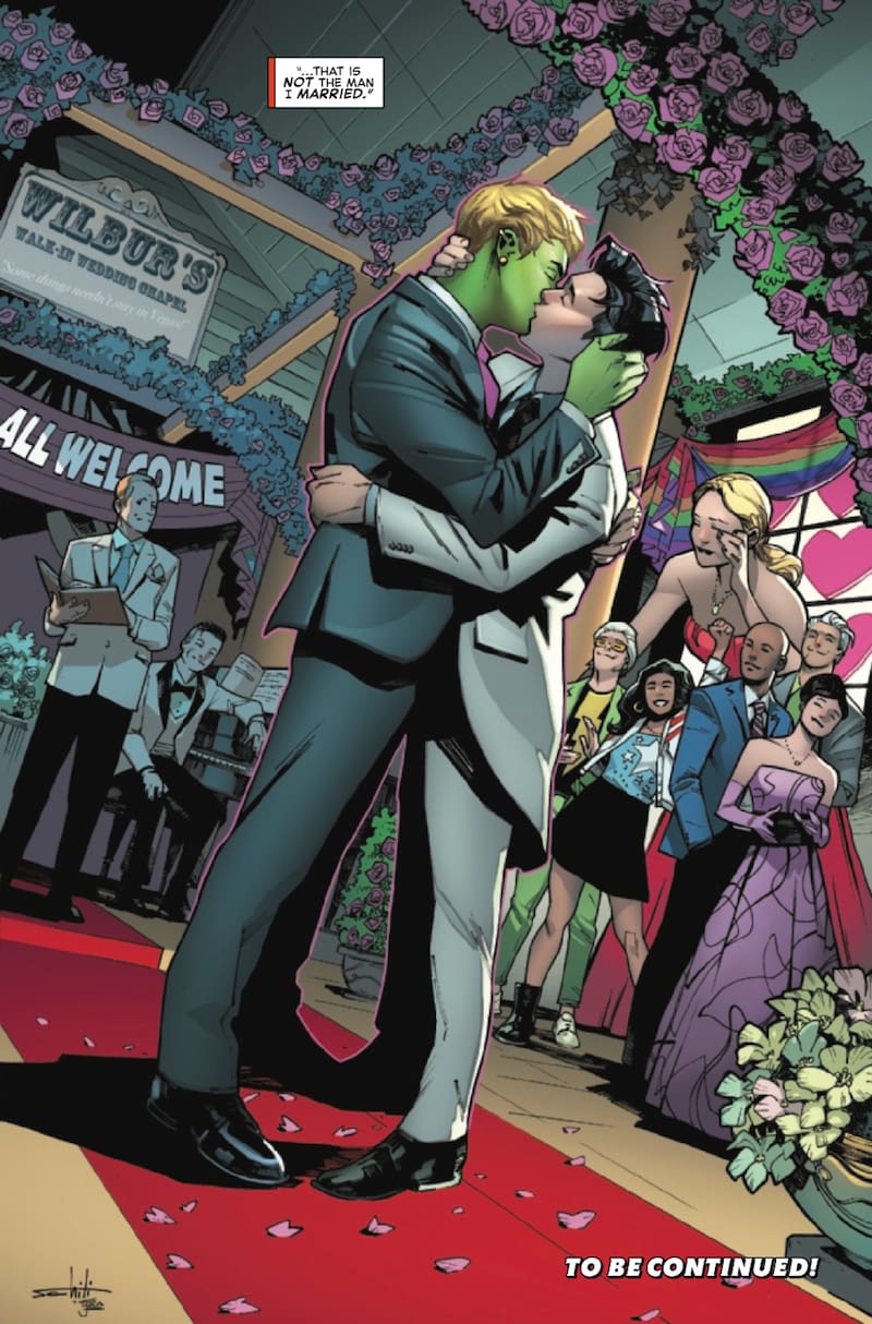 Por supuesto, esta unión entre ambos personajes se presentó como un flashback en el marco de la historia de Empyre. Pero de todas maneras fue un momento interesante para los fanáticos de los Young Avengers ya que, además de llevar a una nueva etapa a la relación entre Teddy y Billy, la página de la boda incluyó apariciones de Kate Bishop, Patriot, America Chavez, Speed, Stature y Marvel Boy.