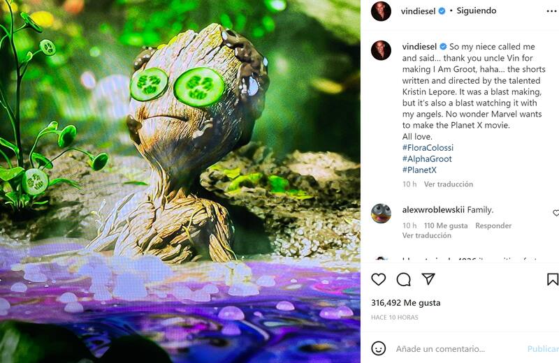 “Así que mi sobrina me llamó y me dijo… gracias tío Vin por hacer I Am Groot, jaja… los cortos escritos y dirigidos por la talentosa Kristin Lepore. Fue genial hacerlo, pero también es genial verlo con mis ángeles. No es de extrañar que Marvel quiera hacer la película Planet X”, señaló el actor en Instagram.