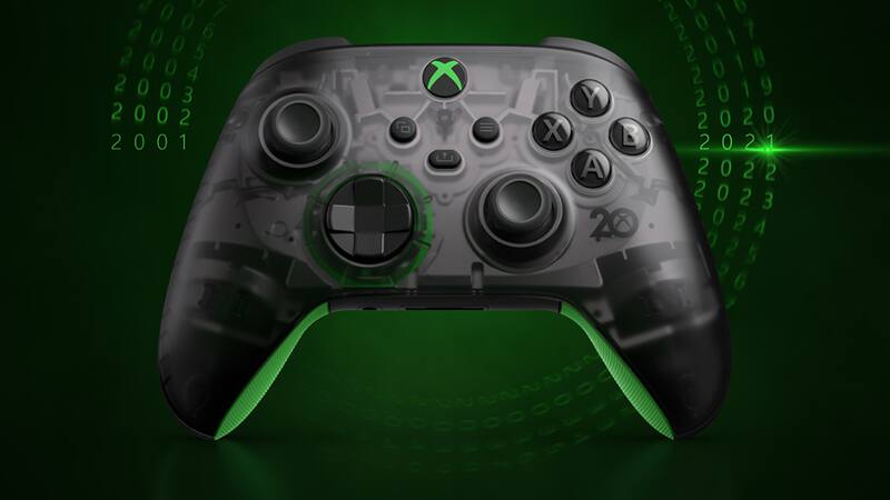 El control compatible con Xbox One, Xbox Series X|S y Windows no solo quiere destacar con el número 20 del aniversario en su superficie, sino que también quiere captar la atención de los jugadores con su diseño translúcido que mezcla gris, verde y negro con un pequeño vistazo al interior del mando.