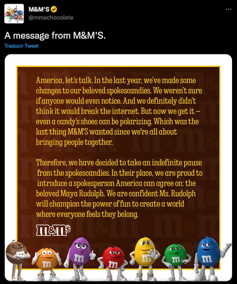 Este lunes y mediante una publicación en redes sociales la compañía dijo: “Estados Unidos, conversemos. En el último año, hicimos algunos cambios en nuestros queridos spokescandies. No estábamos seguros de si alguien se daría cuenta. Y definitivamente no pensamos que rompería Internet. Pero ahora lo entendemos, incluso los zapatos de un dulce pueden ser polarizantes. Que era lo último que M&M’S quería, ya que nuestro objetivo es unir a las personas. Es por eso que hemos decidido hacer una pausa indefinida de los spokescandies. En su lugar estamos orgullosos de presentar a una vocera sobre la que Estados Unidos puede estar de acuerdo: la amada Maya Rudolph. Confiamos en que la señora Rudolph celebrará el poder de la diversión de crear un mundo donde todos sientan que pertenecen”.