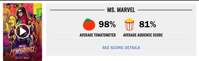 Con aquella valoración en Rotten Tomatoes, Ms. Marvel actualmente es el proyecto de Marvel Studios con el mayor porcentaje de críticas favorables en la plataforma por sobre títulos como Black Panther (96%), What If...? (94%) Avengers: Endgame (94%), Iron Man (94%), Thor: Ragnarok (93%) y Spider-Man: No Way Home (93%).